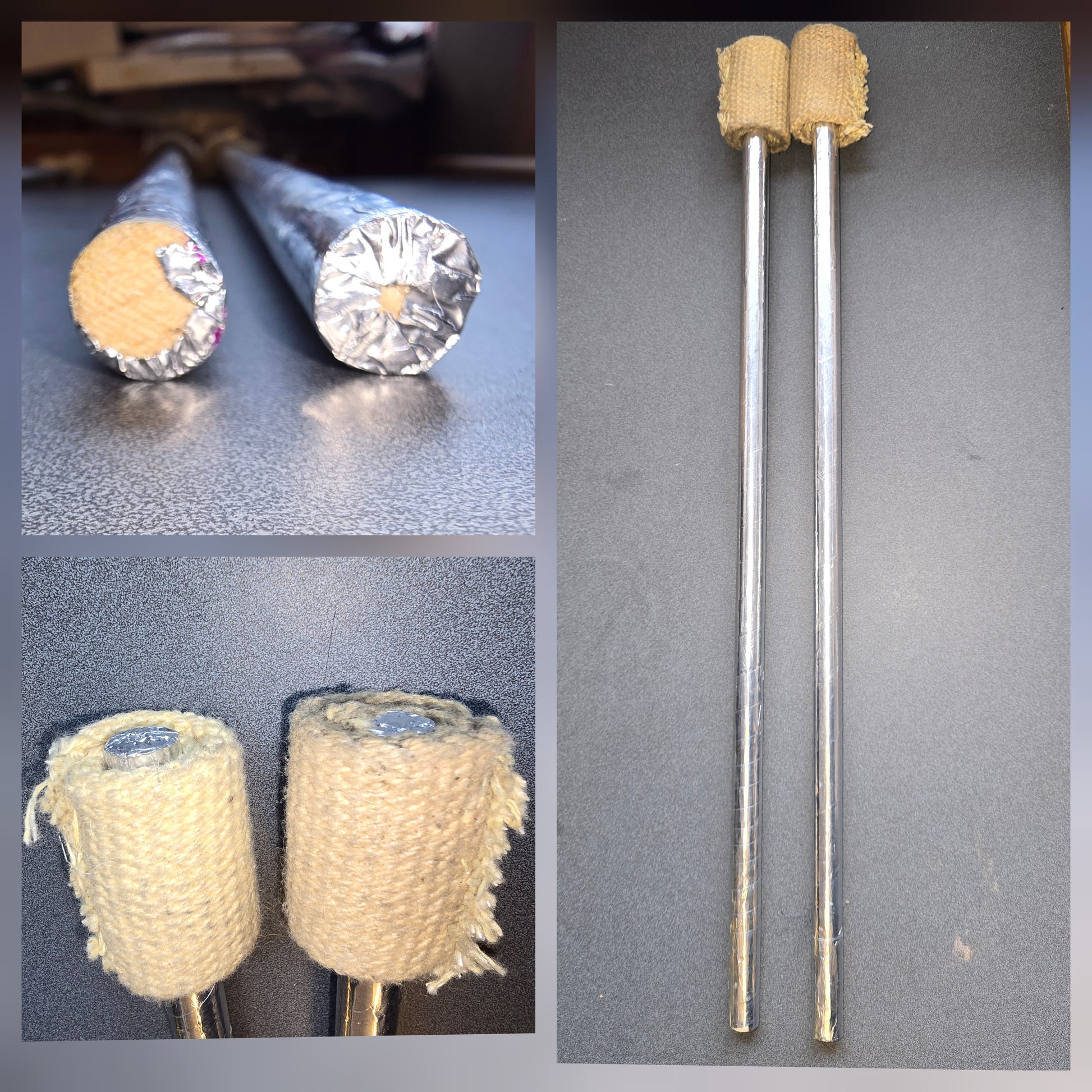 Basic wooden handle, covered in aluminium foil, hand sewn 50mm kevlar wick suitable for fire breathing or body burning heat sensation play.